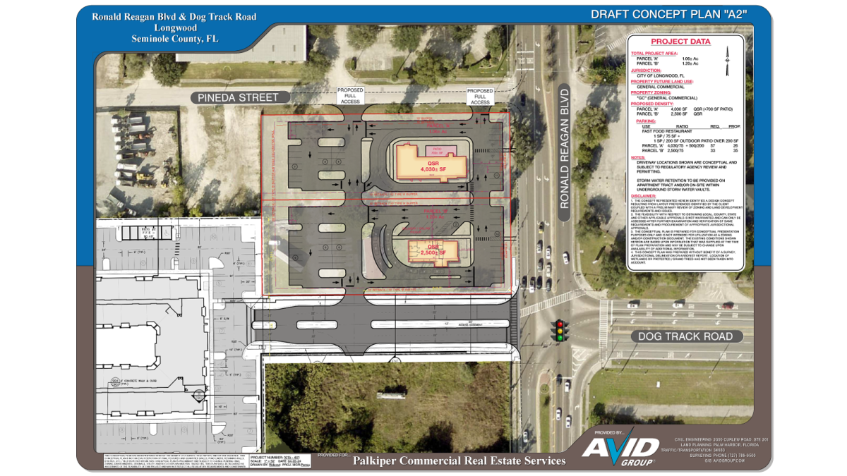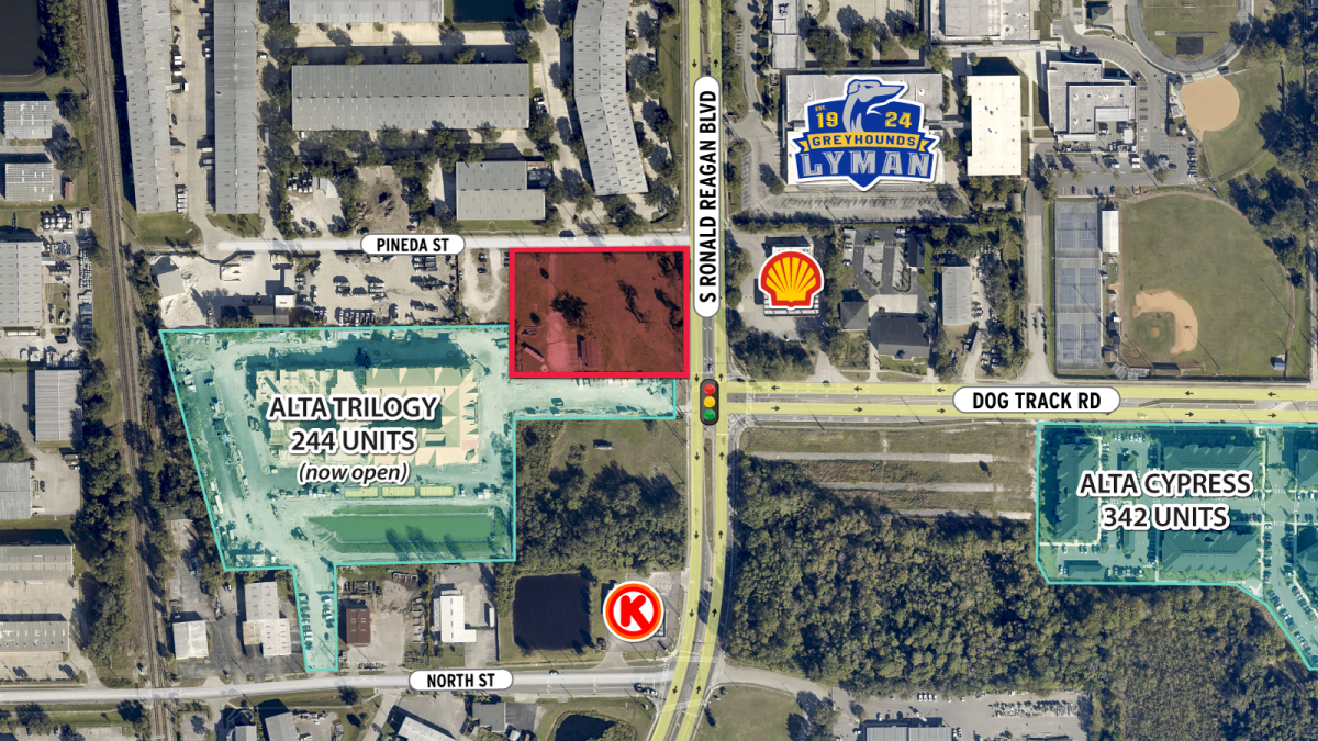 Conveniently located on South Ronald Reagan Boulevard (CR 427), just west of US 17-92, with an average traffic count of 26,000 cars per day. Adjacent to the new Alta Trilogy, a 244-unit luxury apartment complex. Across the street from Lyman High School and Alta Cypress Apartments (342 units) on Dog Track Road. Surrounded by a mix of industrial and commercial sites, with 1,100 new apartments less than 1 mile away. Less than 3 miles from I-4, and less than a 5-minute drive to/from SR 434 and SR 436.